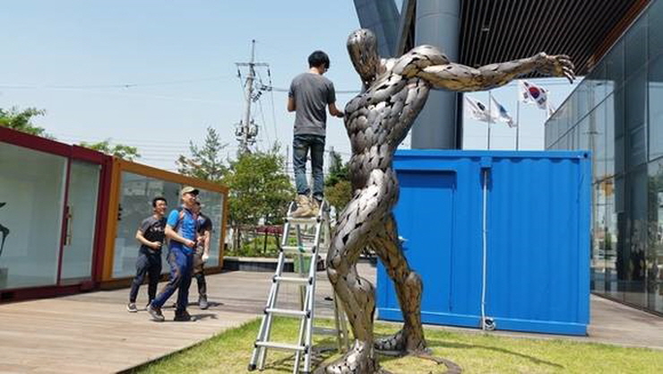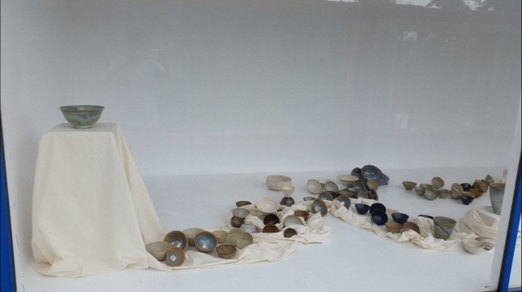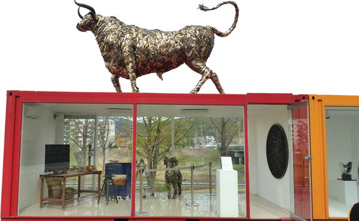 (정의지의 황소작품) 이번에 진행하는 3번째 컨테이너 전 '쇼콘전에 초대된 작가는 3명의 공예가, 조각설치작가의 작품을 선보입니다. 현재 오산에서 혜연도예 공방을 운영 중인 김정옥 공예가는 인간의 마음에 있는 번뇌를 물레작업을 통한 마음의 수련으로 사발과 큰 발, 화기 등을 통하여 표현한 도자기 설치 작품을 선보입니다.
