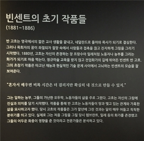 ‘아이가 더 좋아하는 반 고흐 미디어아트 전’ 오는 5월 6일까지 열리는 <반 고흐 미디어 아트전>을 관람하기 위해 아이와 함께 오산시립미술관을 방문했다. 전시는 밀레에 대한 고흐의 존경심, 일본의 화려한 색채를 사랑한 고흐, 위대한 작품들이 탄생했던 인생 후반기 시절에 관한 내용으로, 그의 작품들을 대형 디지털캔버스를 통해 감상하도록 구성되어 있었다. 또 첨단 IT 기술을 접목해 관람객이 그의 작품 안으로 직접 들어가는 경험을 제공했다. - 반 고흐 알아보기 ![]() △ 37년의 짧은 고흐의 일생 ![]() △ 고흐 초기 작품의 이해 ![]() △ 고흐가 존경한 화가 밀레 ![]() △ 반 고흐의 독자적인 화법 탄생 ![]() △ 너무도 유명한 동생 테오와의 형제애 - 대형 디지털캔버스에서 보는 고흐의 작품 ![]() ![]() ![]() △ 캔버스가 아닌 대형 스크린에서 마주하는 고흐의 작품은 또 다른 특별한 감동을 준다. ![]() △ 터치하면 터지는 불빛 ![]() △ 작품 속 고흐와 만나는 VR 체험 ![]() △ 3차원 공간에 디지털 붓으로 그림을 그려보는 3D 아트 브러쉬 - 고흐 작품의 주인공이 되는 포토존 ![]() △ 감자 먹는 사람들 포토존- 앞쪽 의자에 앉으면 작품과 똑같은 모습으로 찍을 수 있다. ![]() △ 밤의 카페테라스 포토존- 작품 속 장소에 있는 것처럼. - 별이 빛나는 밤 작품 속으로 ![]() △ 내가 색칠한 그림이 화면에 나타난다. 고흐의 그림 안에 내 그림이~. ![]() △ 동작 인식 기술 체험 - 팔을 흔들며 마음껏 움직여 보세요. 눈으로만 하는 작품 감상뿐이었더라면 쉽게 지루해했을 아이가 오히려 미술관을 떠나는 것을 아쉬워했다. 기존의 관람 중심 전시와 달리, 작품 속으로 관람객을 참여시키며 고흐의 예술세계를 경험하게 하는 이번 예술체험전시는 누구에게나 좋은 경험이 될 것이다. 170여 점의 주옥같은 고흐 작품을 온몸으로 느껴보자. ![]() |