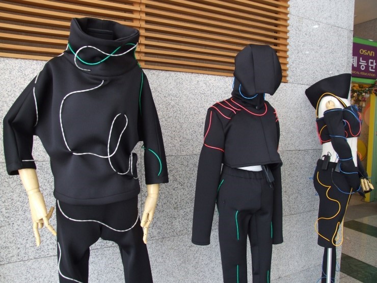 ‘휴머노이드’는 4차 산업혁명으로 변화하게 될 생활공간과 패션의 변화를 상상하며 패션과 IT를 융합한 디자인으로 LED 조명을 소재로 사용하여 표현하였다.
