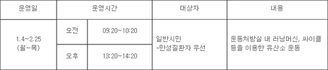 ○ 이용기간: 16년 1월 4일~2월 25일까지 두 달간(매주 월~목) ○ 모집인원: 10명(오전, 오후 각 5명씩) ○ 모집기간: 12월 22일~23일(2일간) ○ 모집방법: 선착순 방문 접수 ※ 등록된 분은 3개월간 신청이 불가하며, 3개월 이후 신청은 가능하나, 신규자 우선 선발됩니다. 이용 후 6개월 경과 시, 신규자로 신청 가능합니다.