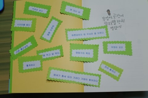 위 사진에서 보는 바와 같이 아이들이 책 속에 나온 여러가지 관용적 표현들을 찾아서 짧은 문장 만들기 훈련을 해 보도록 해 주세요. 단어의 의미를 정확히 이해하고서 나의 것으로 만든 다음 표현들을 활용하여 짧은 문장을 지어 보는 것입니다.