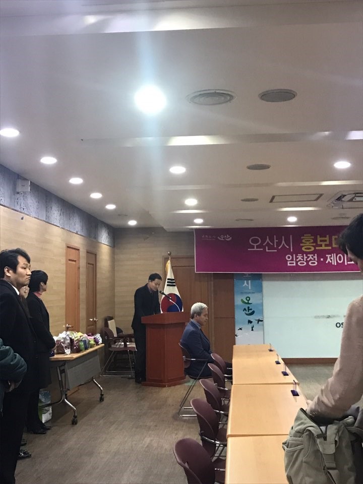 새로운 오산시 홍보대사는 바로 가수 임창정, 제이모닝입니다. 임창정씨는 가수, 영화배우를 비롯해 이미 대한민국 대표 만능엔터테이너로 자리를 잡았고 지난해에는 '내가 저지른 사랑' 이란 곡으로 가요계를 휩쓸며 갓창정의 면모를 보여주었고, 제이모닝은 한류 케이팝밴드로서 각종 지자체 행사는 물론 MBN히어로콘서트 등에 참석하였으며 일렉트로닉 댄스음악으로 많은 사랑을 받고 있습니다. 이미 대중들의 많은 사랑을 받고있는 두 가수들의 위촉식 현장, 궁금하신 분들을 위해 생생하게 전달해 드리겠습니다. 오산시 홍보대사 위촉 현장은 오전 11시 30분부터 오산시청 물향기실에서 진행되었습니다. 곽상욱 오산시장을 비롯해 시청 내 관계자, 임창정, 제이모닝 등이 참석한 가운데 진행되었습니다. 오산시청 2층 물향기실에서 위촉식을 진행하기 직전 모습이네요.