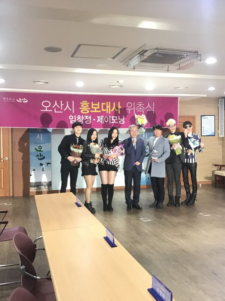 간단하게 위촉식을 마치고 시장님, 임창정, 제이모닝 모두가 함께 기념사진을 남겼습니다.