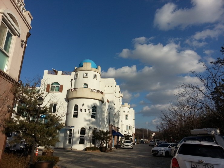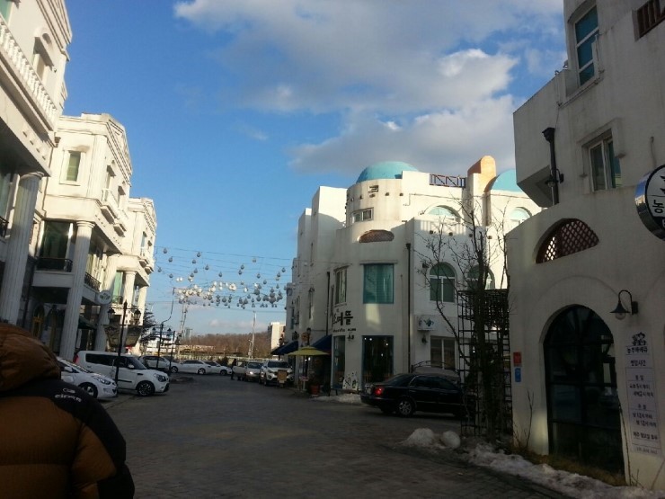 흰색의 건물에 파란색 돔형의 건물이 동화처럼 예쁘게 조화를 이룬 그리스의 산토리니가 생각납니다. 명절 연휴 아산 탕정에 '지중해 마을'이 있다고 해서 다녀왔는데요. 이곳은 산토리니, 프로방스, 파르테논의 유러피언 양식의 건축물을 옮겨놓은 듯하여 이색적인 즐거움을 찾으러 방문하는 사람들이 많습니다. 이날 날씨가 좋아 파란 하늘이 하얀색의 유럽풍 건물과도 잘 어울립니다.