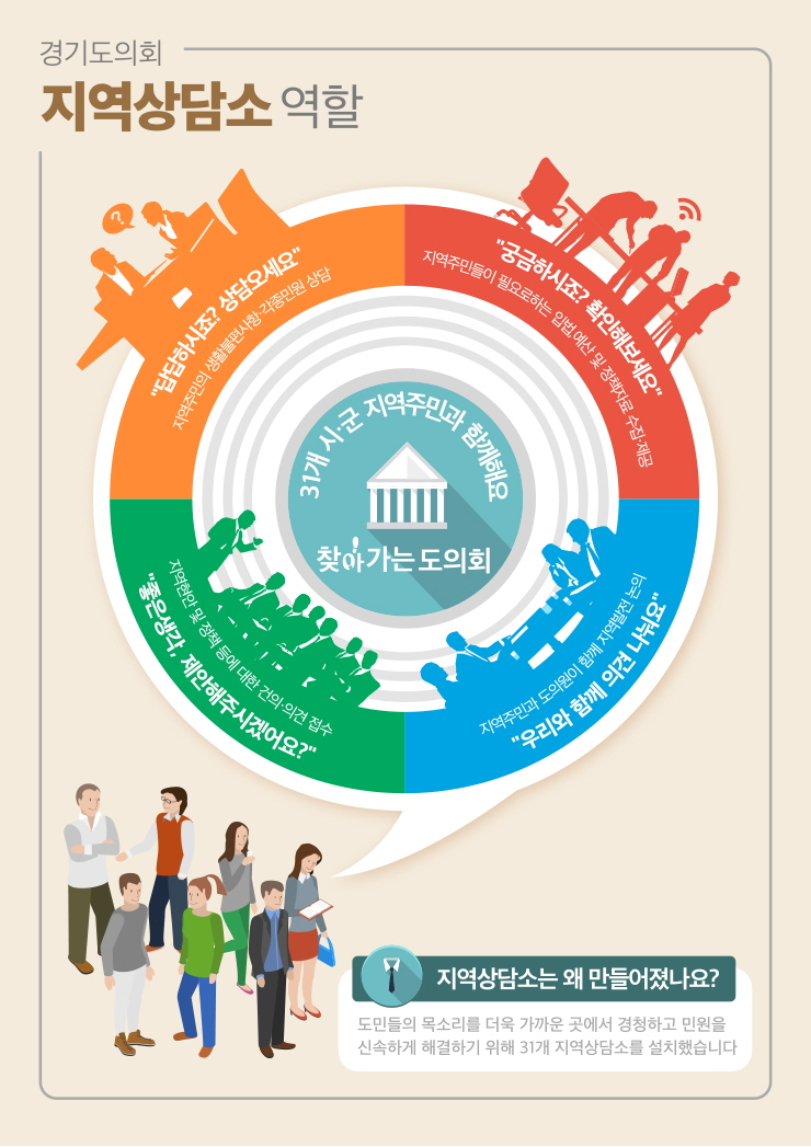 따라서 도의원을 대신하거나 보조할 사람들을 함께 배치해 도민의 상담 편의를 돕는 것이죠. 특히 도내 지역상담소가 모두 문을 열면 효율적 운영을 위해 '전문상담관'배치도 추진 할 예정이라고 합니다!