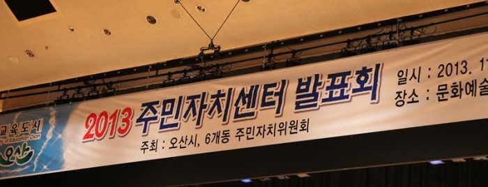 교육도시 대상을 받은 오산시! 혁신교육도시를 넘어 평생교육도시가 되고자 하는 오산의 밑거름에는 주민의 위해 운영하는 문화복지 편익시설의 주민자치센터가 있다. 주민자치센터를 통해 젊어서는 일에 치여, 가족에 치여, 돈에 치여 알지 못했던 숨은 나의 재능을 발견한 오산시민들이 한자리에 모였다. 2013년 한해동안 주민자치센터에서 수강한 수강생들의 기량 뽐내기 발표회가 11월 5일 저녁 5시 오산문화예술회관 대강당에서 펼쳐졌다. [오산 문화예술회관 대공연장]