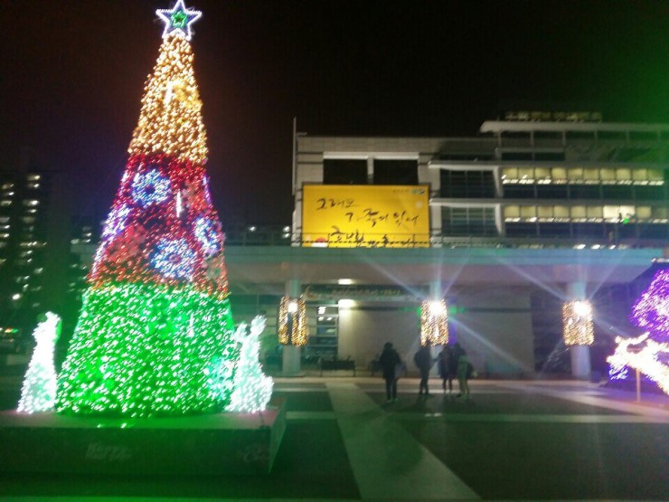 여기는 중앙광장 정면입니다. 여름에는 아이들을 위한 물놀이의 장소로, 겨울에는 이렇게 로맨틱한 대형트리가 있는 장소로 변해있습니다. 3단 트리장식과 트리 꼭대기에 있는 별이 인상적인데요, 이 트리는 이미 오산시청의 빼놓을 수 없는 장식 중 하나인 것 같습니다. 이미 오산시청 크리스마스 트리라고 하면 많은분들이 기억하고 있기 때문입니다.