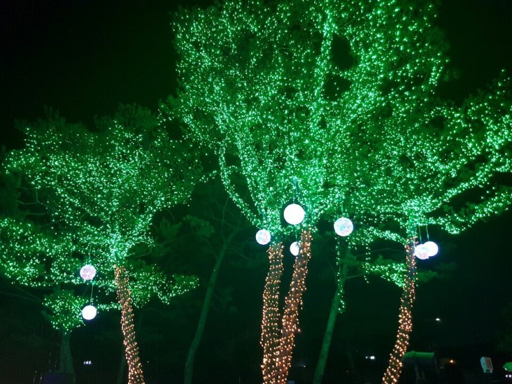 겨울이라 우수수 떨어졌던 낙엽들의 빈 자리를 채우듯 꽤나 큰 나뭇가지에 초록색 전구들이 가득차 있었습니다. 별똥별이 떨어지듯 꼭 하늘에서 초록 별들이 떨어지는 광경같지 않나요?