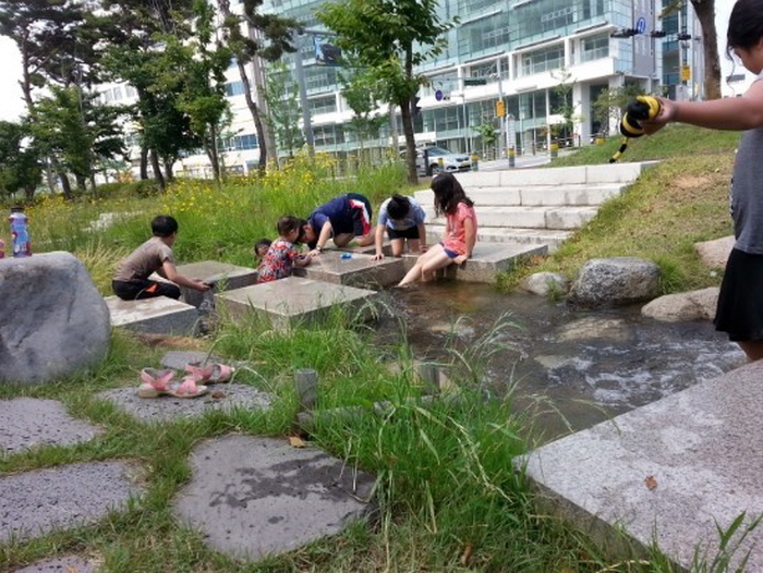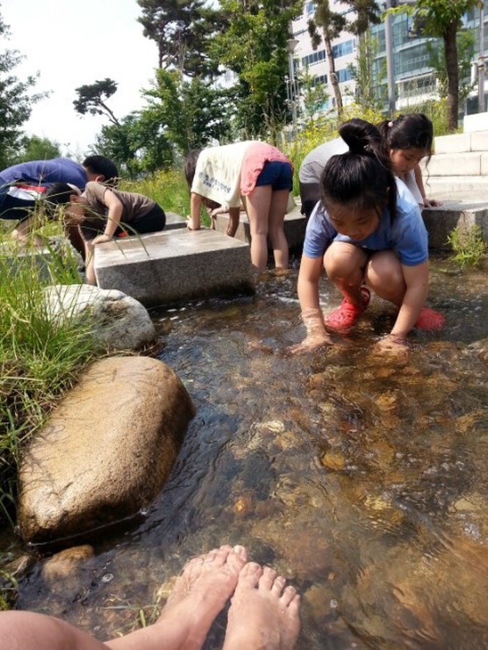 세교1단지와 2단지에 사는 지인들의 집 앞에 있다는 말 하나만 듣고 갔는데, 정말 1, 2단지와 도로 사이에 물이 퐁퐁 시원하게 흐르는 실개천이 있었습니다. 물 깊이는 어른의 발목에서 살짝 올라오는 정도여서 아이들 놀기에 적당했어요. ![]() 물이 제법 많고 물살도 쎄 보이죠?