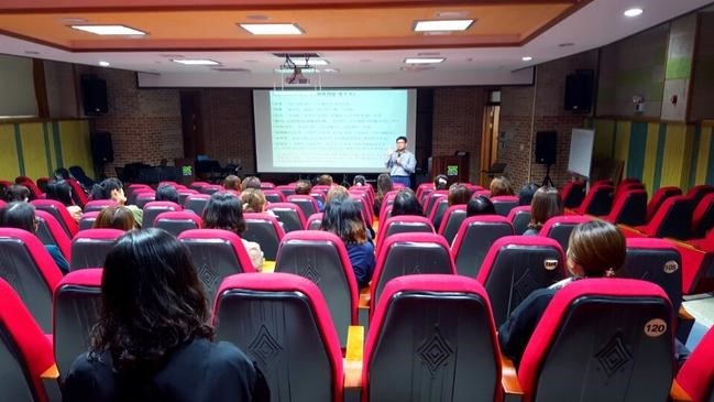 ▲ 필봉초 시청각실에서 학교폭력예방 강사초청 학부모 연수를 진행하는 모습 (2016)