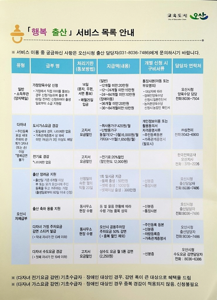 더 자세하게 말씀드리면 행복출산 원스톱 서비스란 출산 가족들에게 필요한 출산 지원 서비스로 양육수당(다자녀), 출산지원금, 다자녀 공공요금 감면 등 각종 출산지원 서비스를 출생신고할 때 한 번에 신청하는 통합 서비스라고 합니다.