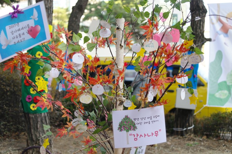 ▲ 평생학습 마을, 상상 마을 수업에 대한 감사의 마음을 적어 걸어 둔 감사 나무이다. 아이들의 감사 메시지가 또 다른 감사와 기쁨을 낳았다.