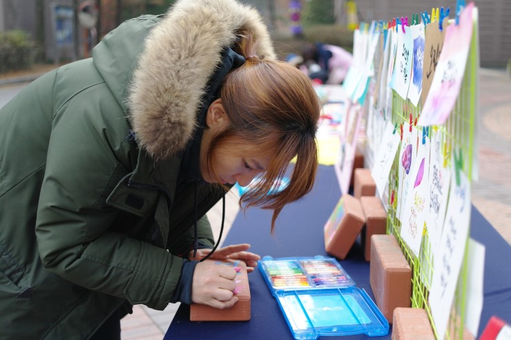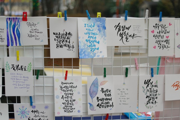 ▲ 캘리그라피 전시, 벽돌 위에 즉석에서 캘리그라피로 작품을 만들었다.