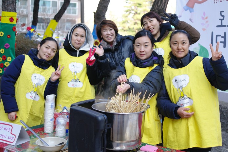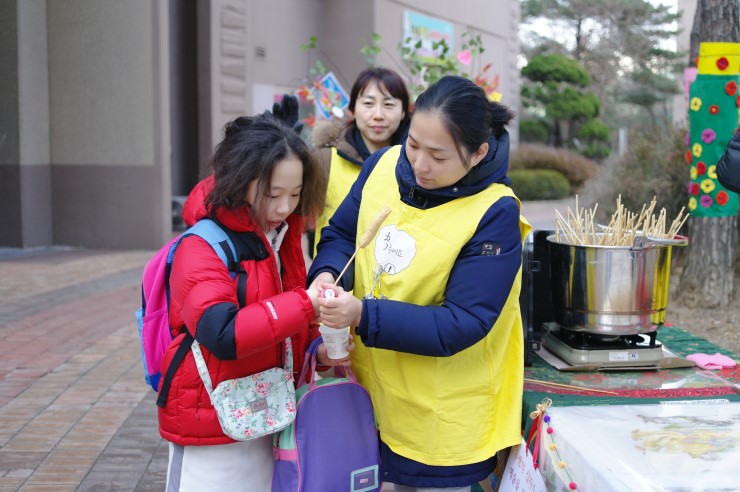 ▲ 전시장을 찾은 학생에게 인증 도장을 남겨 주는 모습이다. 봉사자들은 추운 겨울 날 따뜻한 어묵과 국물로 하교하는 학생들의 차가운 몸을 녹여 주었다.