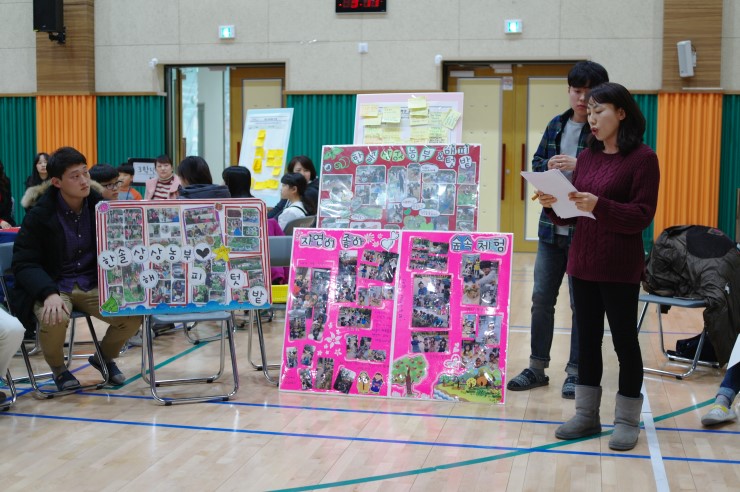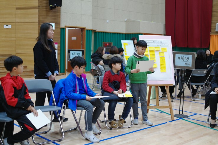 ▲ 학생들이 다양한 의견을 적고 발표를 하는 모습이다. 각 학년별로 모둠을 만들어 열띤 토론을 마치고 학생과 학부모 대표가 나와서 토론 내용 결과 내용을 발표하였다.