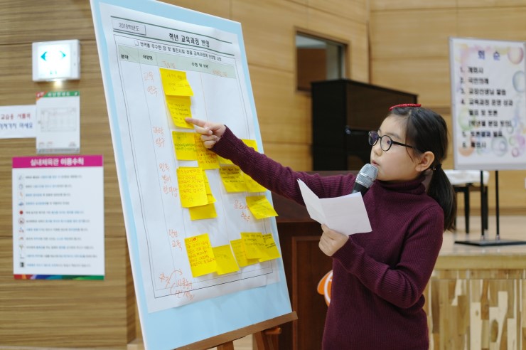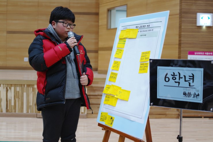 ▲ 토론 결과를 발표하는 6학년 학생이다. 영역별 우수한 점 및 발전시킬 점 등 교육 과정에 반영할 사항들을 발표했다.