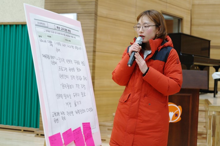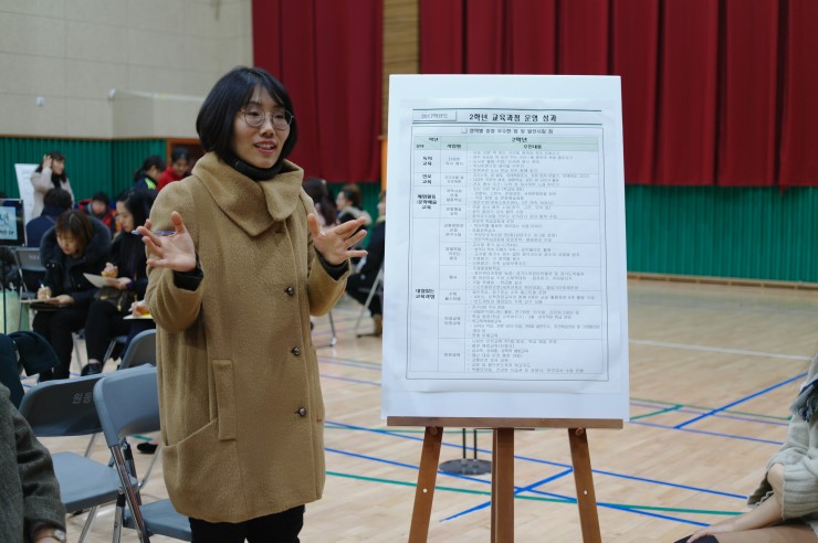 1학년 교육 과정 반영을 발표하는 학부모 대표이다. 문화 교육에서 다양한 나라, 나라별 수업 시수를 늘렸으면 한다는 의견이었다. 체육활동에 있어서도 장기적, 반복적으로 꾸준히 연습하여 학생들 간에 실력이 나누어지는 점을 해소하고자 하였다.
