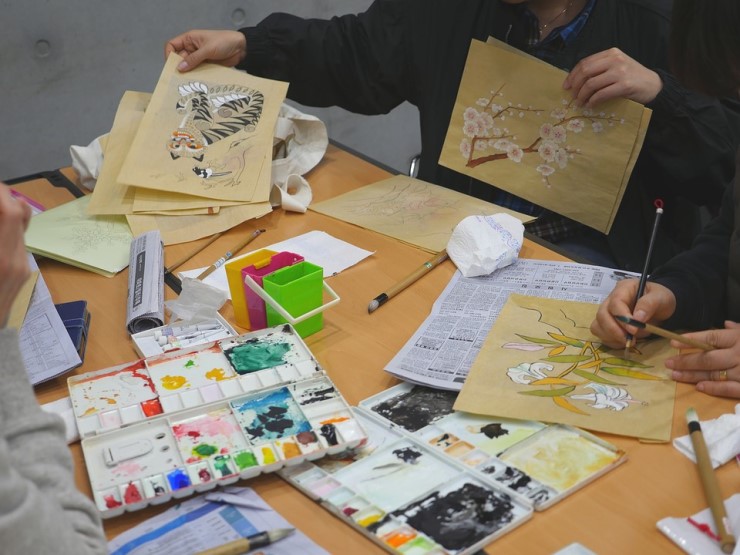 2018년도 1분기 수업중 '민화로 오산 그리기'에 참여였습니다. 강좌 등록할때만해도 10주, 3달이라는 시간이 길게만 느껴졌는데 어느새 종강이 되었네요. ![]() 오산의 꽃인 매화를 그리고 있습니다. 매화는 역사적으로 오산에 매화가 많았다는 기록이 있으며, 다른 꽃보다 가장 먼저 핀다고 하여 꽃의 우두머리라 불리었다고 하네요. ![]() 색을 입힐수록 꽃이 화사하게 살아나네요! 이것이 민화의 매력이 아닌가 싶어요~ ![]() 정해진 색은 없어요~ 자신의 스타일대로! 바쁜 일상속에서 민화를 하는 시간만큼은 시간이 느리게 흐르는 것만 같습니다. 얼마나 힐링이 되는 시간이었는지^^ ![]() 민화가 특히 재미있었던건 그림마다 그 의미가 다르다는 것이었는데요. 나리꽃 : 풍요 마음의 안정, 다산, 화합 매화 : 행복, 장수 모란 : 부귀영화, 장수 연꽃 : 군자의 고고함, 청빈함, 부부화목 화조도(꽃과 새) : 부부화목, 부귀, 장수 ... 마음을 전하고 싶은 사람에게 민화와 그 의미를 전달하면 더욱 뜻깊은 선물이 될 것같아요^^ ![]() 모두 처음 민화를 배우시는 분들인데도 너무 곱고 예뻐요~ 시민대학 강사님이 너무 잘가르쳐주셔서 수강생 전원이 아름다운 많은 작품들을 만들 수 있었답니다! ![]() 오산의 새 까마귀입니다. 까마귀는 예로부터 신성한 새로 지혜와 용맹, 충효를 상징하며, 고구려 시대에는 태양안에 삼족오를 그려 신성한 새로 상징되었다고 하네요. 이 똘망똘망한 눈! ![]() 그동한 작업했던 결과물을 돌아보는 시간. 모두 숙제를 열심히 해주셔서 짧은 시간동안 많은 작품을 그릴 수 있었습니다. 다 펼쳐놓고 함께 감상하는데 괜히 뿌듯한 기분! ![]() 판넬 작업도 진행하였습니다! 이렇게 하면 집에도 걸어도 좋고 선물하기에도 좋을 것 같죠? ![]() 오산백년시민대학과 함께 배우고 나누는 기쁨을 체험해보세요~ ![]() |