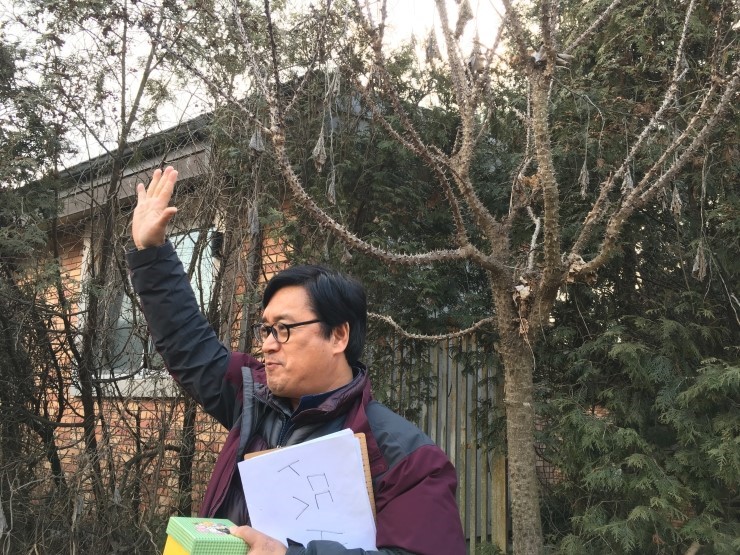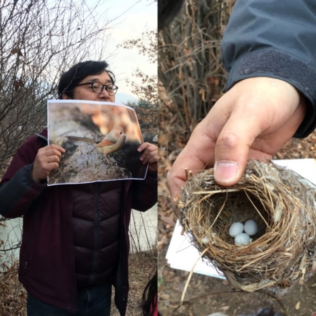 다음으로 단풍나무가 많은 연못 근처로 장소를 옮겼어요. 여기서 단풍나무 씨앗 모양의 의미와 새들이 이 나뭇가지에 앉아 중요한 무엇을 하는지 궁금증을 풀어 주었답니다. 그 옆에 있는 조팝나무를 좋아하는 뱁새의 특징을 설명하던 중 뻐꾸기는 왜! 유독 뱁새의 둥지에만 알을 낳는지 맞추기도 하고요.