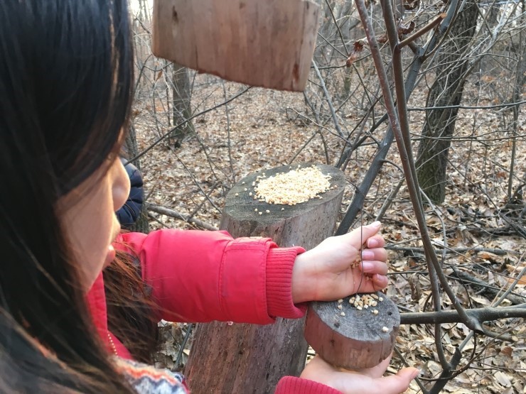 오늘의 마지막 코스 새들에게 모이를 주기 위해 숲속으로 갔어요. 쉿! 어린이들 종알대는 소리에 새들이 도망가버렸네. 아무도 없지만 살포시 놓아주고 왔어요.