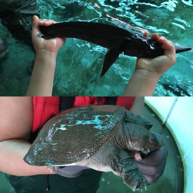 오늘은 여기서 그만~ 텐트 안은 미리 켜 놓은 전기담요로 너무 따뜻했어요. 가족 모두 침낭 속 번데기가 되어 쿨쿨 zz 다음날, 아침 일찍 일어난 아이들이 해먹을 타며 노는 소리에 잠에서 깼는데 다행히 날씨도 좋고 많이 춥진 않았어요. 오늘은 철갑상어와 자라를 만날거에요. 아침을 준비하면서 보니 한 집, 두 집, 건너 건너 아이들이 어느새 친구가 되어 함께 노는 모습이 보였는데 참 보기 좋았어요. 간단한 아침을 먹고 철갑상어와 자라의 생태체험을 하러 갔는데요, 철갑상어는 보기보다 순해서 아이들의 손에도 가만히 있었고 또 다른 모래속에서 겨울잠을 자고 있던 자라는 무척 귀찮아 하는 표정이라 모두들 많이 웃었답니다. 이곳은 생태체험으로 철갑상어를 직접 잡아보고 자라도 자세히 관찰할 수 있고 게다가 자라쇼까지 준비되어 있어 어린이들에게 인기만점이라고 해요.