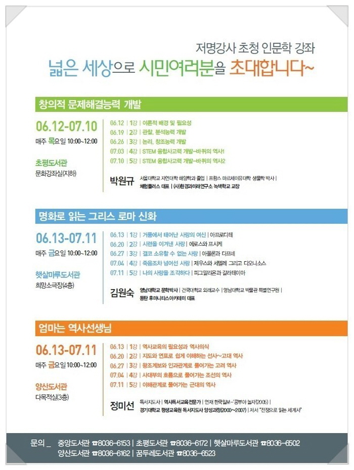 위에 앞으로 남은 일정을 안내하니, 관심이 있는 시민은 지금이라도 초평도서관으로 전화해 접수하길 바란다. (초평 * 8036-6172)
