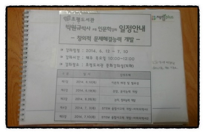 초평도서관에서는 박원규 박사의 <창의적 문제해결능력 개발>에 관한 두번째 강좌가 열렸다. 매주 목요일마다 진행되는 본 강좌는 이제 총 3회가 더 진행될 예정이고, 아직 자리도 여유가 있으니, 이 기사를 읽고 관심이 생기는 시민은 지금이라도 신청하기를 바란다. (초평 * 8036-6172)