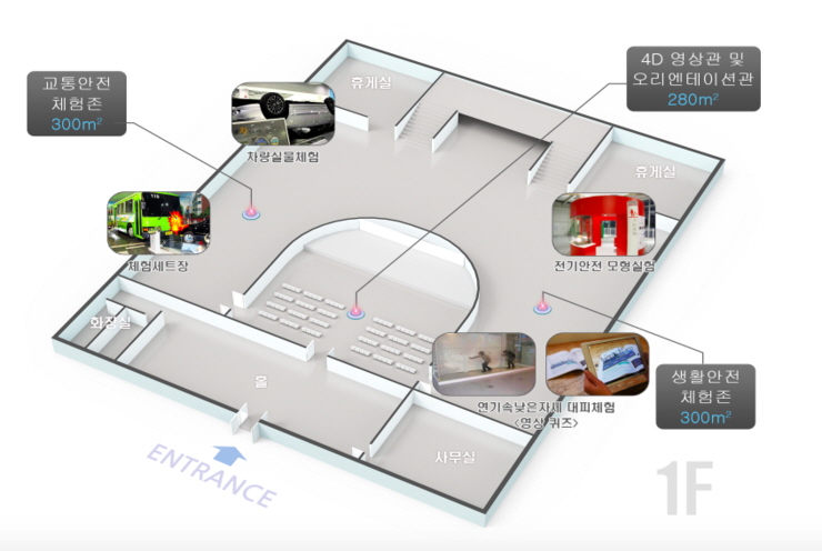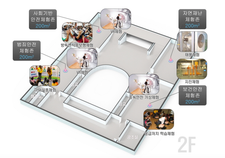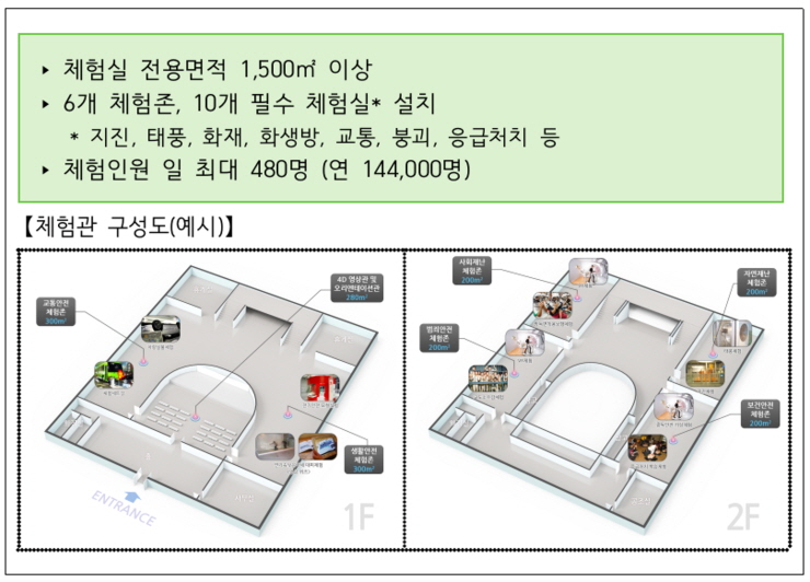 *체험실 전용면적 : 1500㎡ 이상 *6개 체험존, 10개 필수 체험실 설치 : 지진, 태풍, 화재, 화생방, 교통, 붕괴, 응급처치 등 체험인원 일 최대 480명(연 144,000명)