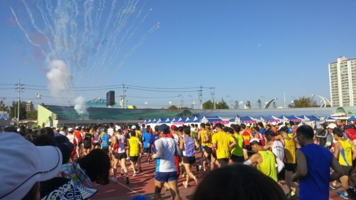 날씨도 축하하는듯 환한 햇살을 비추고 하나, 두울, 세엣, 네엣, 다섯으로 카운트다운하며 폭죽과 함께 제일 먼 거리인 하프부터 달리기가 시작됩니다.