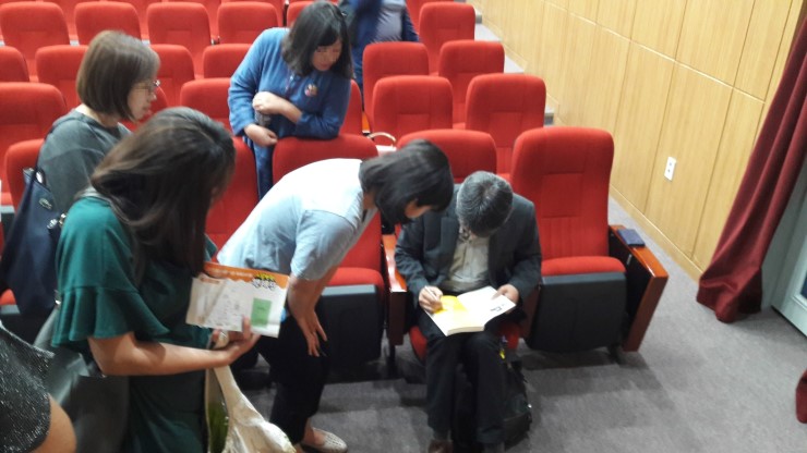 유명 작가임을 증명이라도 하듯, 책을 구입해 와 싸인을 받으려는 청중들이 줄을 섰다.