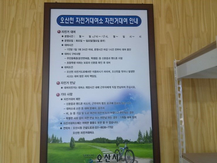 운영시간은 09:00~18:00까지이고, 대여시간은 총 4시간이다. 오산시민이 아니어도 신분증만 지참해서 간단한 신청서만 작성하면 되니, 인근지역에 사는 분들도 한번오산천 자전거여행을권해본다.