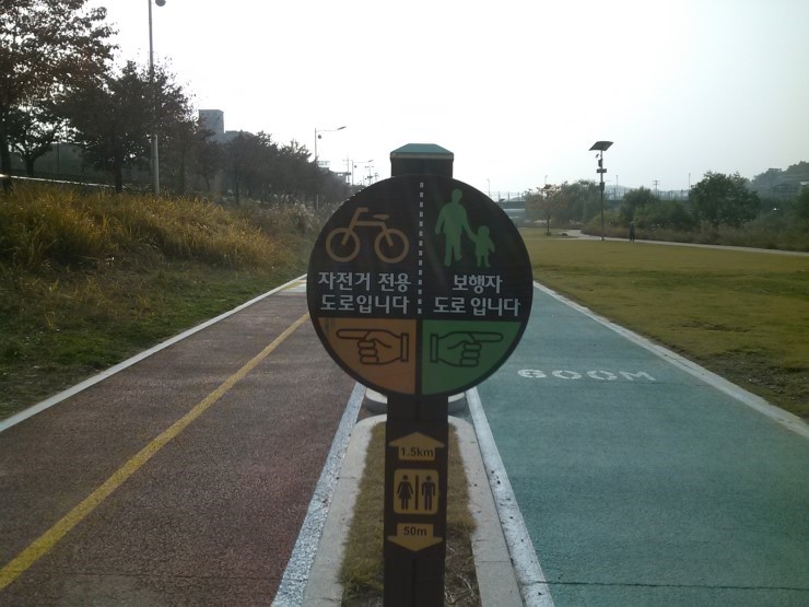 왼쪽은 자전거 전용 오른쪽은 보행자 전용으로 나뉘어져 있다.