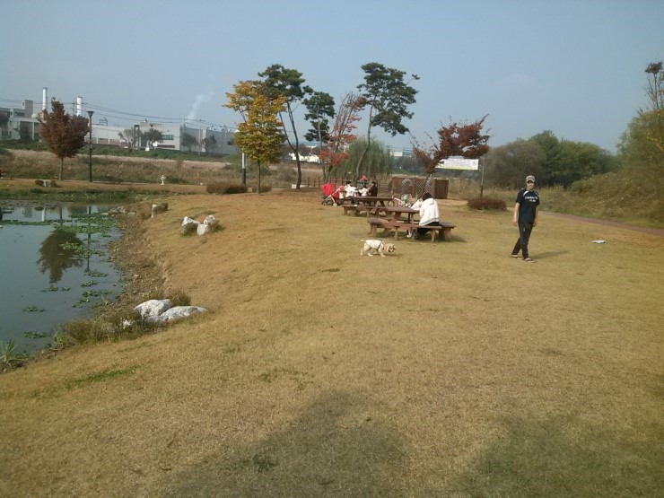 맑음터공원을 지나가니 벤치와 간단한 간식을 먹을수 있는 곳이 있다. 연못에는 오리들이, 잔디밭에는 강아지가 이미 여기저기 뛰어놀고 있다.