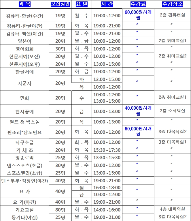 2016년 제 1 기 주민자치센터 문화강좌 수강생 모집 ♣ 운영기간 : 2016. 1. 4(월) ~ 2016. 4. 22(금) (16주) ♣ 수강신청자격 : 만20세 이상 대원동민 (정원 미달시 타동신청가능) ♣ 접수기간 : 1차-신규수강자 2015. 12. 14(월) ~ 12. 15((화) (오후6시까지) 2차-신규&재수강자 2015. 12. 16(수) ~ 12. 18(금) (오후6시까지) ♣ 접수방법 : 선착순 방문접수만 가능 (신분증 및 수강료지참, 카드수납불가, 현금영수증불가) ♣ 수강료감면대상 (50%) : 국가유공자, 장애인, 국민기초수급자, 만65세이상 어르신 셋째(만13세이하)이상 자녀를둔 다자녀가정 (증빙자료사본지참) ♣ 환불기준(수업참여 상관없이) : 개강전(전액), 개강1주이내(50%), 개강1주이후(환불불가) ♣ 기타사항 : - 수강신청인원이 모집정원의 70%를 넘지 못하는 과목은 개강하지 않습니다. - 야간 수업은 19:20 까지만 출입이 가능하오니 시간 엄수요망.