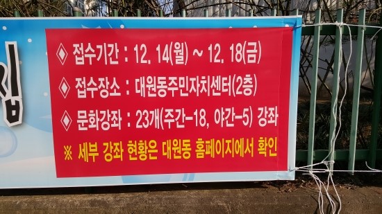 대원동 주민자치센터는 제가 살고 있는 거주지에서 도보로 갈 수 있는 거리에 있습니다. 이곳에서 2016년 제 1기 문화강좌 수강생을 모집한다는 공고입니다.