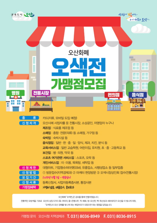 4월 1일부터 연중 상시로 오색전 가맹점 모집을 하고 있답니다. 대형마트나 유흥업소, 사행성 업소 등 일부 업종을 제외한 전통시장 및 소상공인과 자영업자는 가맹점 가입이 가능합니다. ![]() ![]() 모바일 앱 충전 방법은 경기지역화폐 앱을 설치하고 회원가입과 공 카드를 신청합니다. 그리고 카드 수령과 등록 후 개인 충전 계좌를 연결하고 금액 충전 후 사용 가능합니다. '오색전'이 소비자에게 어떤 혜택이 있을까요? 첫 번째 예산 범위 내에서 개인 구매자에 한해 충전금액의 6%의 추가 포인트가 지급됩니다. 두 번째 설이나 추석 명절 및 특별 기간에 충전금액의 10%의 추가 포인트가 지급됩니다, 세 번째 소득공제가 30%의 절세 효과를 보실 수 있답니다. 오산지역 경제의 발전을 위해 많은 이용 바랍니다.