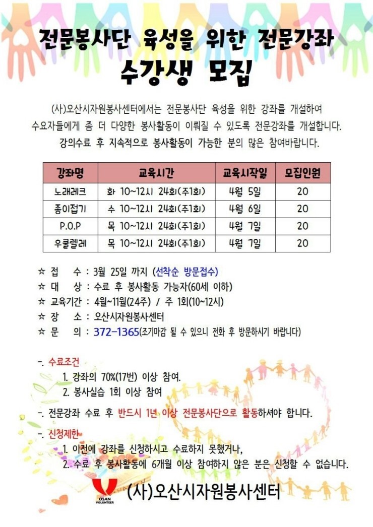 | 오산지자원봉사센터 전문봉사단 육성을 위한 전문강좌 수강생 모집<시민기자 권은용>; | |||||