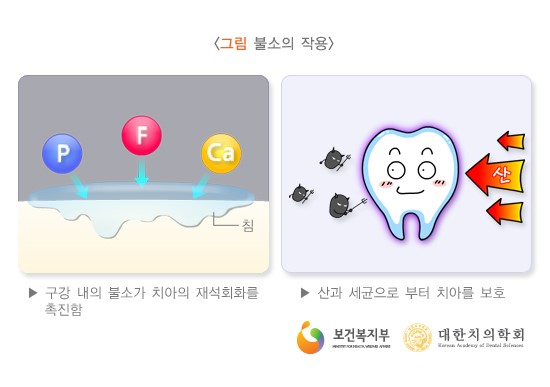 불소를 도포하면 왜 충치가 예방될까요? 불소이온이 치아 바깥쪽 법랑질 속에 침투하면 법랑질의 결정구조가 안정이 됩니다. 이 안정된 결정구조에서는 충치균이 만들어내는 산에 대해 내성을 가지기 때문에 충지가 예방이 된다고 합니다.