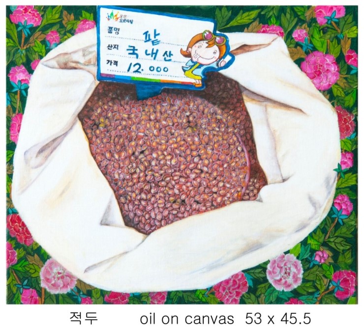 한국의 멋, 적두 작품에서는 목단, 나비 등 민화의 오브제를 차용하여 작가만의다양한 작품 세계를 보여주고 있다.