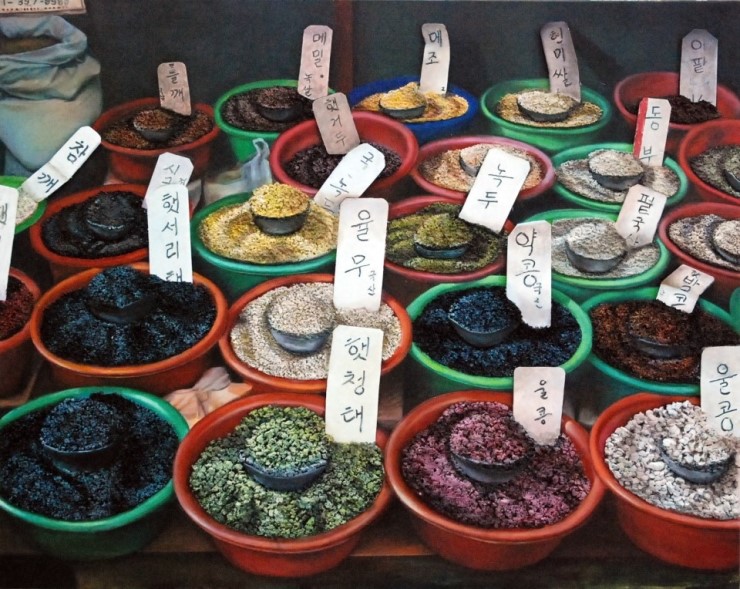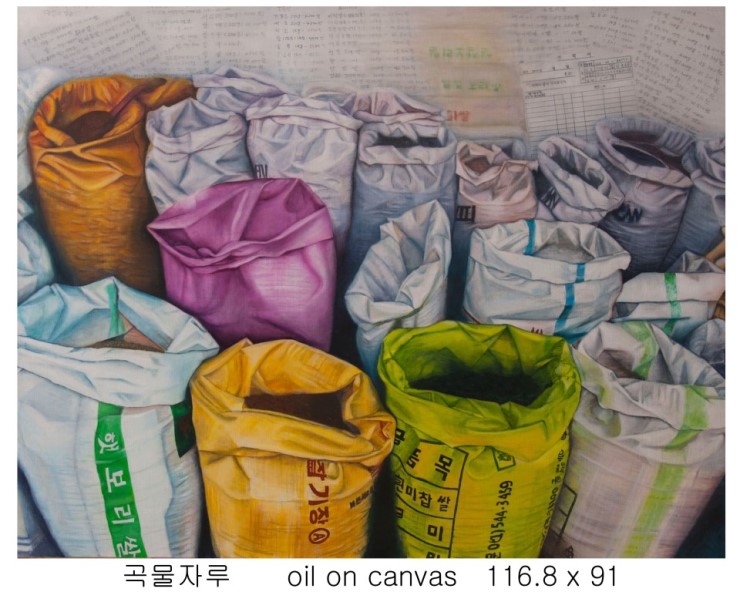작품 곡물상회, 곡물자루, 수건 등에서 볼 수 있듯 오색시장의 역사와 상인들의 삶을 진하게 녹여 하나하나 작품에 채워 넣고 있다.
