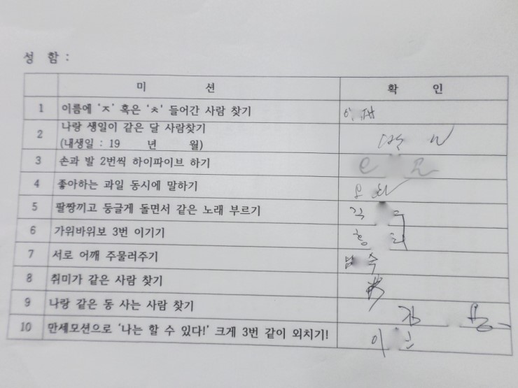 이어서 다들 초면이라 서먹한 분위기를 해소하기 위해 서로를 찾아가 공통점을 찾고 인사하는 아이스브레이크 시간과 짤막한 자기소개 시간을 가졌습니다.