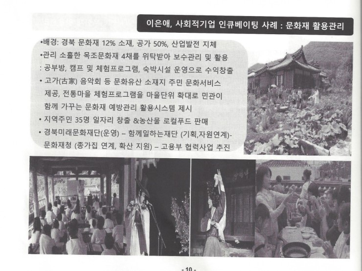문화재 관리의 문제점을 인식하고 그 문제를 해결하기 위해 만들었던 사회적기업 인큐베이팅의 사례를 소개하며 문제가 발생했을 때 제기되는 좋은 질문들과 서로의 필요를 연결할 때 좋은 사회적기업이 만들어질 수 있다고 하였습니다.
