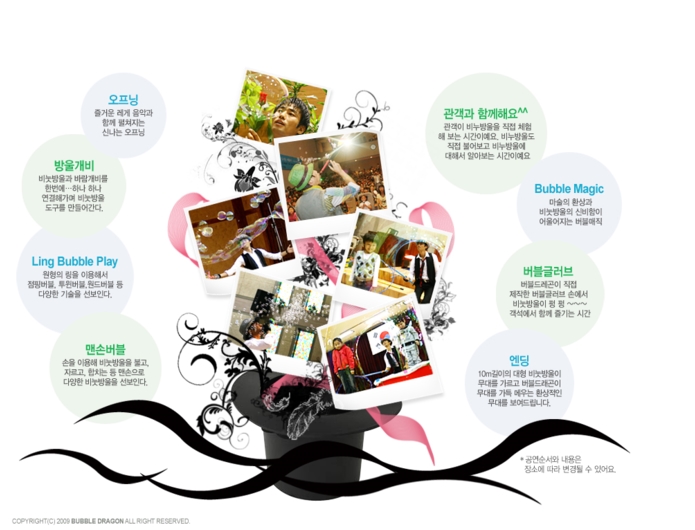 이름은 신용. 버블과 龍 드래곤을 합쳐서 버블드래곤이라는 닉네임을 만들었다고 해요. 국내 1호 버블아티스트로 꿈과 희망이 있는 공연을 모토로 하고 있는 공연가입니다. 여러 방송에서 소개된 적이 있으며, 지금도 활발하게 공연을 진행하고 있고요.