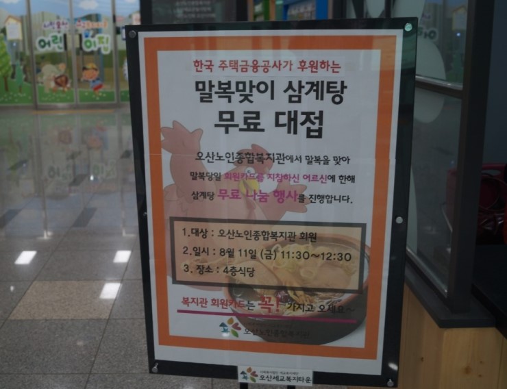 이번 말복 삼계탕 대접 행사에는 한국주택금융공사가 지역 어르신들의 건강증진을 위하여 지원해 주었다.