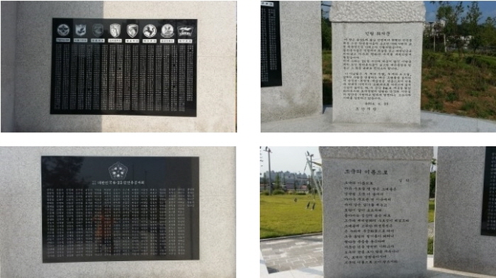 이 탑의 우측은 월남전 참전 용사의 이름들이 부대 별로 명시 되어 있고 좌측은 6.25 참전 용사들의 이름이 적혀 있다.