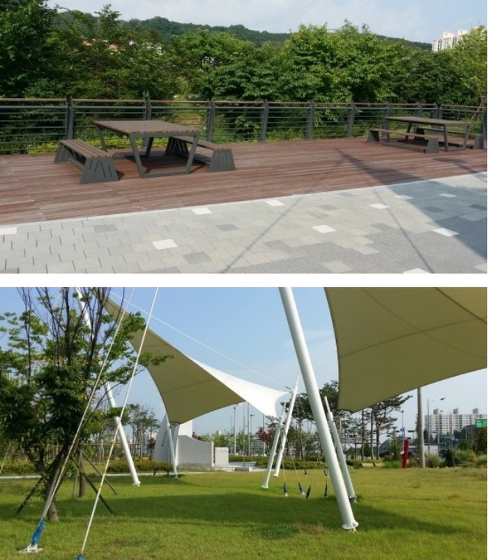 공원을 한참 돌다 보면 쉬어 갈 곳이 필요한데 적당한 장소에 앉아서 대화를 할 수 있는 탁자와 잔디 밭이 나타난다.