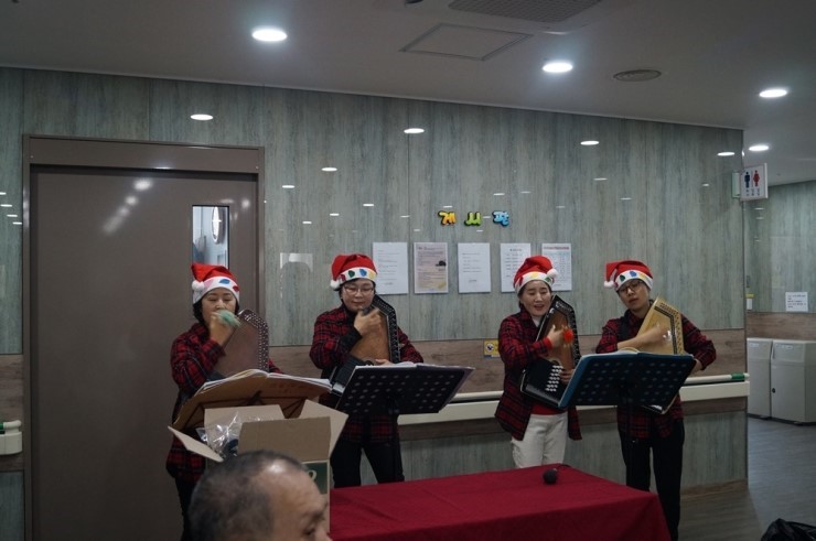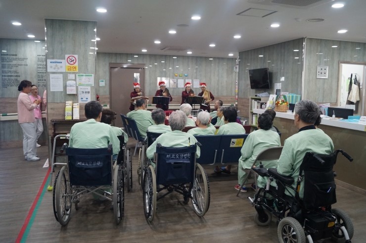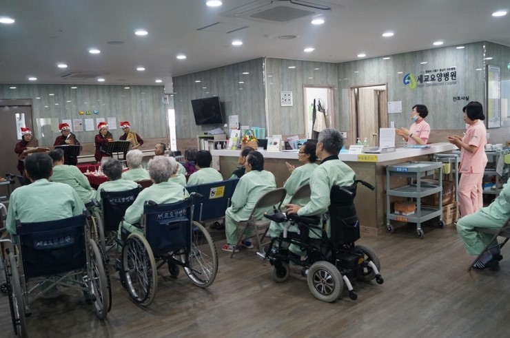성탄절을 이틀 앞둔 23일 오후 2시 오산시 수목원로 462 (금암동)무한 메디칼 센터 3~6층 에 위치한 세교요양병원에서 는 작은 위로 잔치가 벌어 졌다. 세교지역 에 위치한 모 성당 신자 몇 명이 그동안 배우고 익혀온 크로마 하프 악기 연주로 병석에 계신 환자를 방문하여 위로하고 병실을 찾아 말벗도 하는 시간을 가졌다. 악단 큰언니 (김병옥 60) 씨는 병원에 장기 입원 중인 환자들은 사람이 그립고 사랑이 그리운 분들임을 체험 했다“면서” 우리가 남을 위로 한 맘큼 우리도 나중에 위로 받을수 있다는 신념에서 매월 1회 단원이 병원 을 방문하여 동화 구연과 악기 연주로 환자들의 치유에 힘을 보태고 있다“고” 말했다.