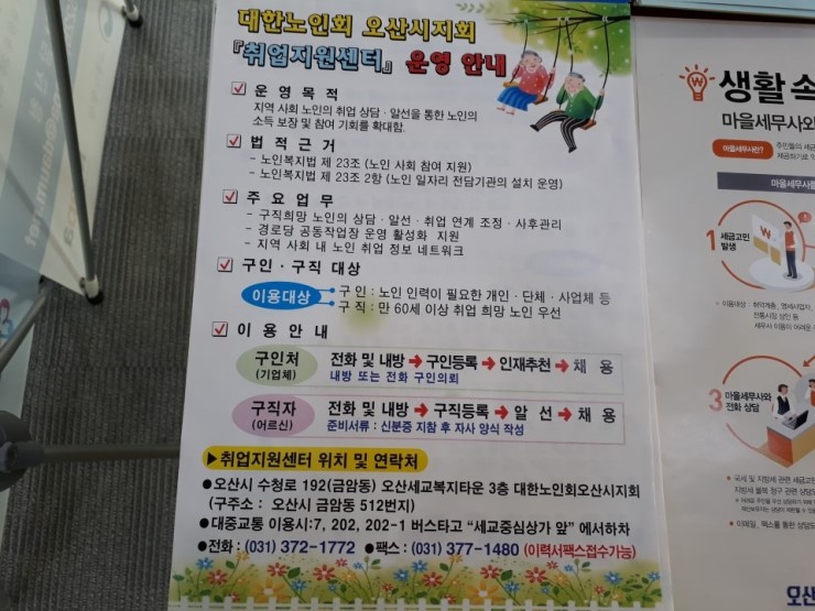 '대한노인회 오산시지회' 취업지원센터에서는 지역사회 노인 취업과 상담을 통해 노인의 소득 보장 및 참여 기회 확대를 위해 프로그램을 운영하고 있으니 구직을 희망하는 어르신들은 이용하면 좋을 것 같습니다.