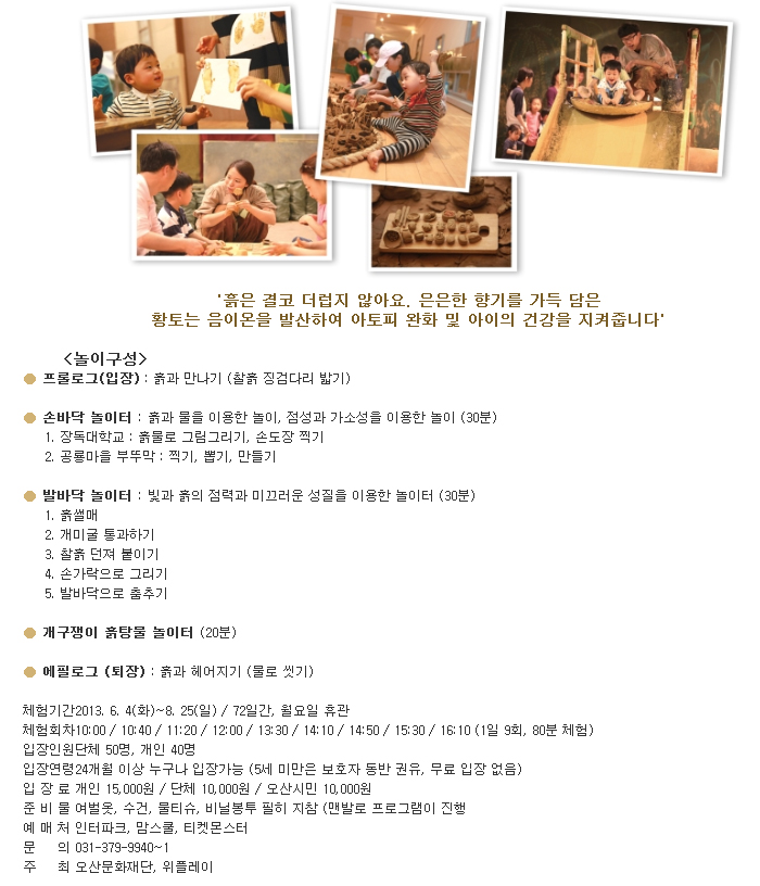 2013년 06월 04일(화) - 2013년 08월 25일(일) 까지 문화공장 오산 1층 체험교육실에서 체 험 프로그램 시리즈 4탄 이영란의 오물조물 딱딱 “흙놀이”가 총9회 체험시간 80분의 프로그램으로 “흙은 결코 더럽지 않아요, 은은한 향기를 담은 황토는 음이온을 발산하여 아토피 완화 및 아이의 건강을 지켜줍니다”라는 체험 취지를 가지고 진행 중 입니다.