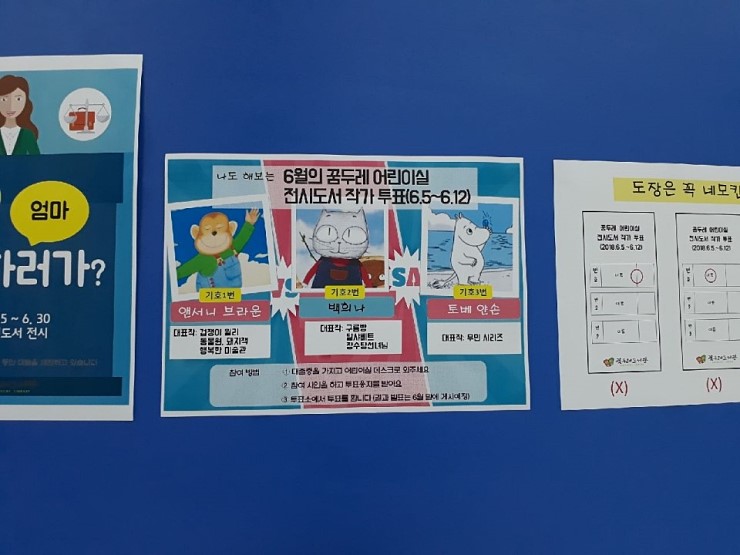 소중한 한 표로 국민이 진정한 주권행사를 할 수 있는 날이었는데요. 주권행사의 의미로 꿈두레도서관 어린이실에서는 6월 5일부터 12일까지 전시 도서 작가 중 마음에 드는 작가를 투표하여 뽑는 '전시 도서 작가 투표'라는 특별한 행사가 있었습니다. ![]() ![]() 선거의 의미를 알고 선거의 4대 원칙을 적용하여 훌륭하다고 생각하는 작가 1인을 뽑는 재미있고 특별한 행사였는데요. 작가 후보로는 기호 1번 '케이터 그린어웨이 상'을 수상한 '고릴라'와 '돼지책'으로 많은 사랑을 받은 저자 앤서니 브라운과 기호 2번 '구름빵시리즈'를 만든 대한민국의 대표 그림책 작가 백희나와 기호 3번 '무민시리즈'를 만든 핀란드의 스웨덴계 동화작가 토베 얀손이 후보로 선정되었답니다. ![]() ![]() 꿈두레도서관의 주요 고객인 우리 아이들은 비밀투표의 원칙에 따라 예쁘게 꾸며놓은 투표소에 들어가 소중한 한표를 건네고 꿈두레도서관 회원의 권리행사를 예쁘게 하였습니다. ![]() 질서 있게 한 줄로 서서 자신의 차례를 기다리는 의젓한 모습까지 모습을 보이며 자신이 찍은 1인이 보이지 않도록 예쁘게 반으로 접어 투표함에 넣고 있는 모습입니다. ![]() ![]() 과연 투표 결과가 어떻게 나올지 기다려지는데요? 우리 아이들에게 가슴에 와닿고 감동을 주며 재미를 준 책의 작가는 누가 될지 궁금해집니다. 꿈두레도서관에서 이뤄진 '전시도서 작가 투표' 행사로 우리의 유일한 주권행사방법인 '선거'의 의미를 알려주고 아이들이 간접경험을 통해 '참여'의 기쁨을 누려볼 수 있는 추억이 되었을 것 같습니다. ![]() |